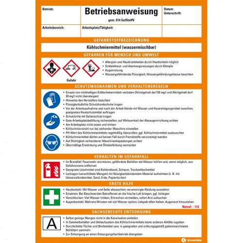 Betriebsanweisung Kühlschmiermittel, CLP/GHS, Kunststoff, 210x297mm, ASR A1.3, DIN EN ISO 7010