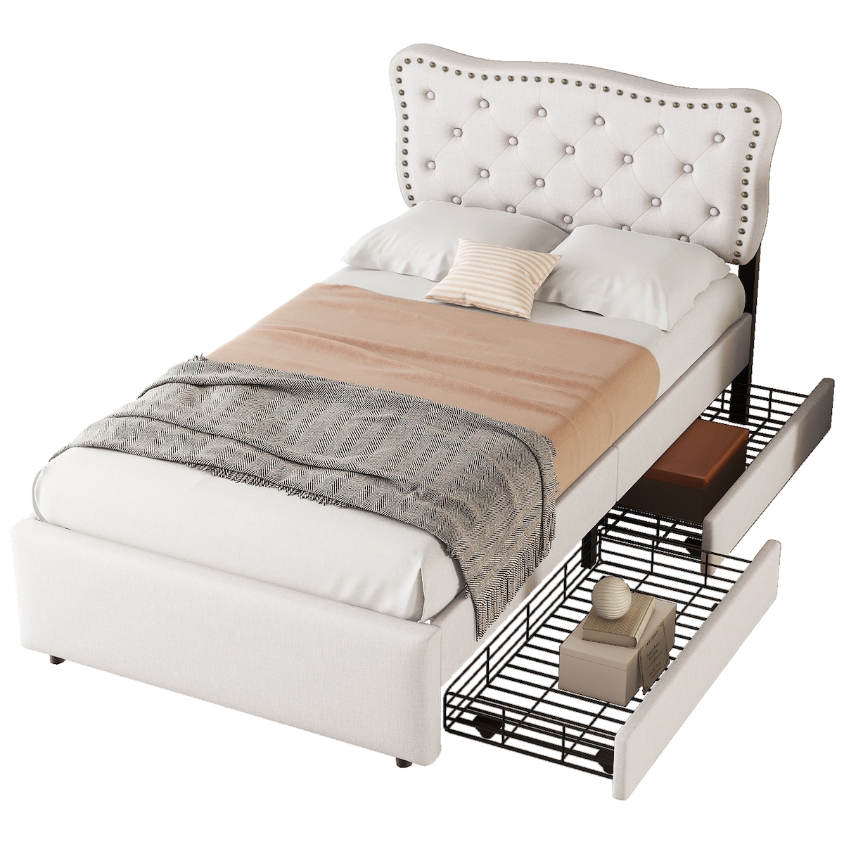 STILVORA Flaches gepolstertes Bett 90x200 in Hellbeige mit dekorativen Nieten und 2 Schubladen – Elegantes Design für Ihr Schlafzimmer