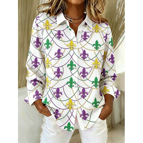 Carnevale Per donna Camicia Blusa Grafico Geometrico Astratto Vintage Elegante Casual Manica Lunga Scollo a V Colletto a Camicia Top Regolari Quotidiano Patchwork Bottoni Stampato Bianco Viola chiaro
