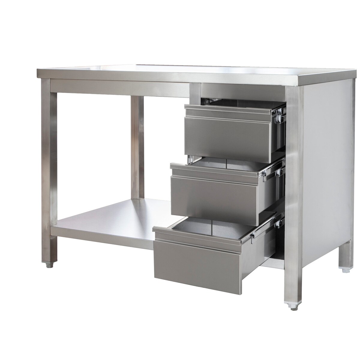 A&S Gastro Edelstahl Arbeitstisch mit Schubladenblock rechts verschweißt | Bautiefe 700mm | mit Grundboden | AI : 2000 x 700 x 850 mm
