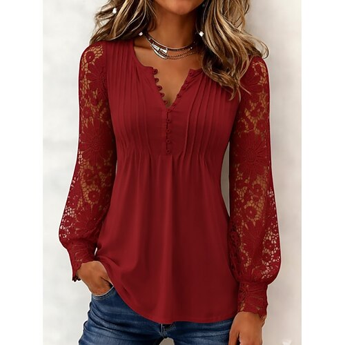 Per donna Blusa Tinta unica Elegante Casual Manica Lunga Scollo a V Top Regolari Quotidiano Pizzo Patchwork Bottoni Blu Nero Bianco Rosso Viola Primavera Autunno