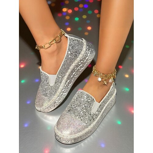 sneakers slip-on con plateau e glitter argento da donna - scarpe casual con strass scintillanti per feste notturne e outfit da discoteca