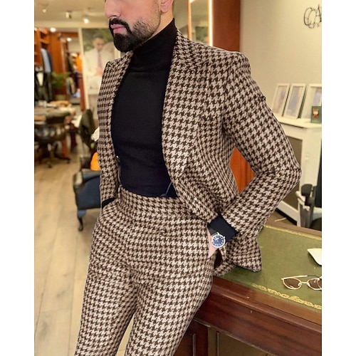 Uomo Matrimonio Completi in Tweed A lancia Nero Marrone A quadri Vestibilità su misura 2 pezzi Monopetto a un bottone