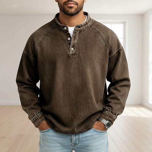 maglietta da uomo in 100% cotone, maglietta a maniche lunghe, tinta unita, henley, abbigliamento da casa, manica lunga, abbigliamento color block, abbigliamento vintage, casual quotidiano, stile di