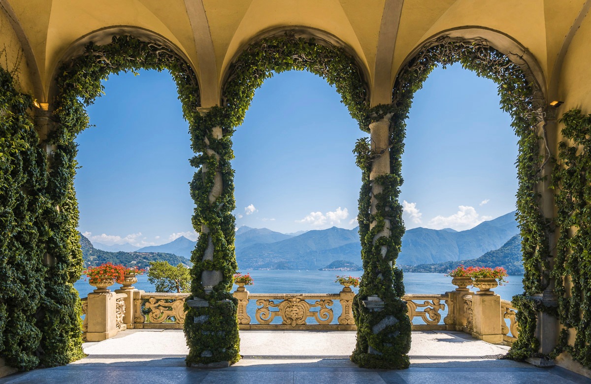 Fototapete PAPERMOON "TERRASSE-SÄULEN LANDSCHAFT GEBIRGE BLUMEN NATUR MEER", bunt, B:5,00m L:2,80m, Vlies, Tapeten