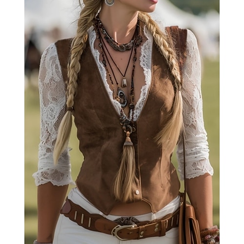 Per donna Blusa Top in pizzo Tinta unica Elegante Manica Lunga Scollo a V Top Regolari Quotidiano Ferie Uscire Pizzo Patchwork Marrone chiaro Estate Primavera