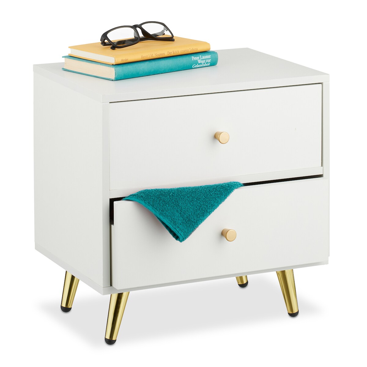 Relaxdays Nachttisch, 1 Stück, 2 Schubladen, HxBxT: 41,5 x 40 x 32,5 cm, Schlaf- & Gästezimmer, Nachtschrank, weiß/gold