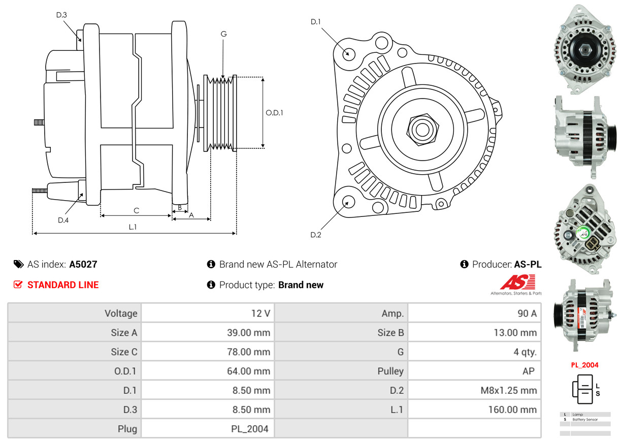AS-PL Generator A5027 12V 90A für MITSUBISHI HYUNDAI (BEIJING) MD153843R MD149750 3730033103R
