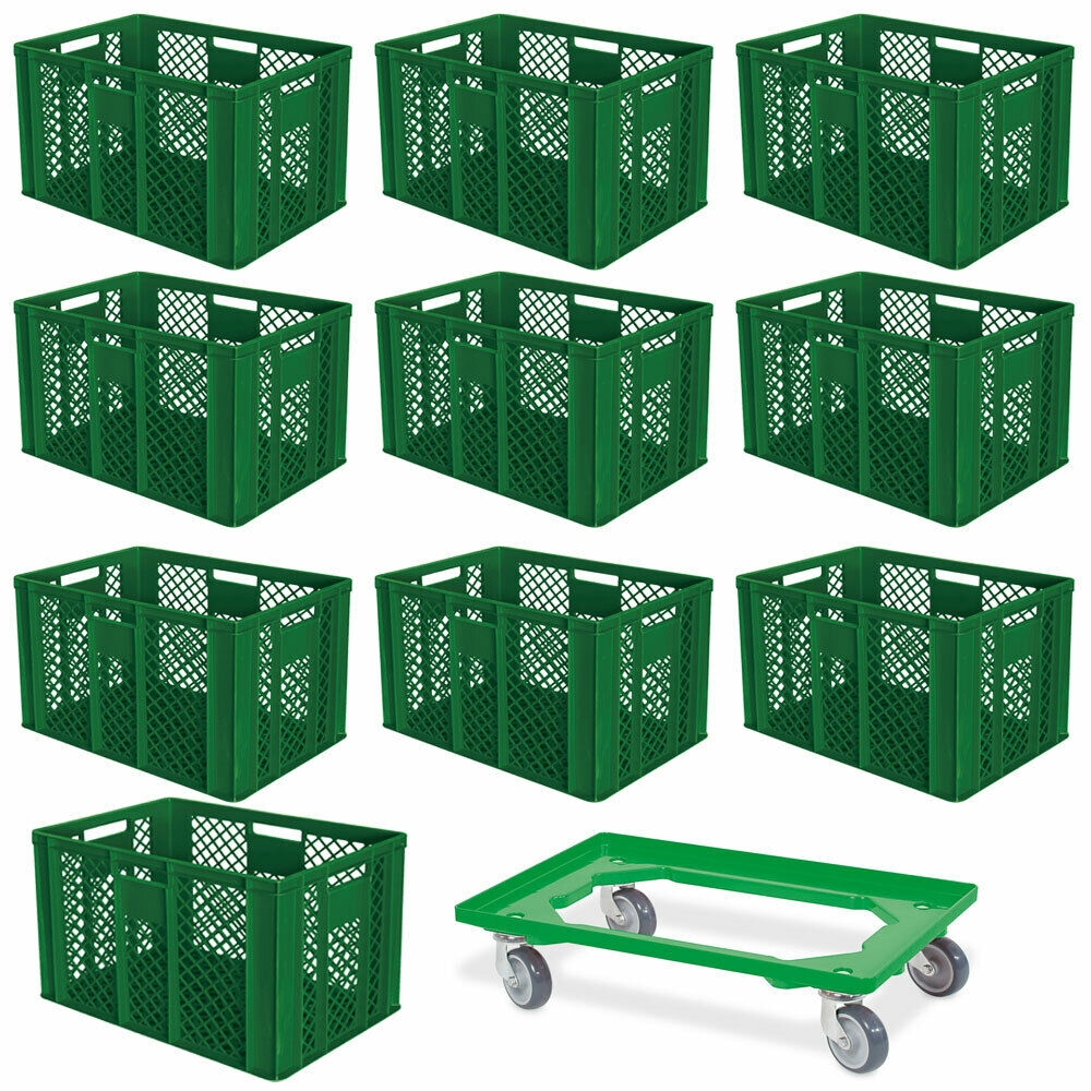 BRB 10 Euroboxen, 600x400x410 mm, lebensmittelecht, grün + 1 Transportroller, grün