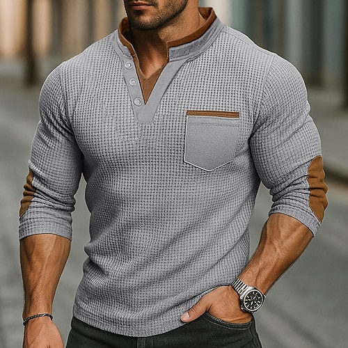 Per uomo Maglietta Waffle Maglia Henley a nido d'ape Camicie da uomo con toppe sui gomiti Manica Lunga Collo alla coreana Inverno Autunno Tutte le stagioni Tinta unica Moda Essenziale Casual Tasche