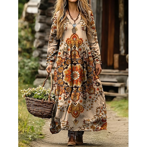 Per donna Abito maxi Abito a trapezio Vacanza Casual Quotidiano Ferie Vestibilità comoda Floreale Grafico Manica Lunga Scollo a V Blu Arancione Estate Primavera