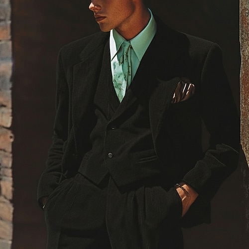 Uomo Matrimonio Affari Abito in velluto a coste Bavero classico Nero Borgogna Affari Abito Tinta unita Vestibilità su misura 3 pezzi Monopetto a un bottone