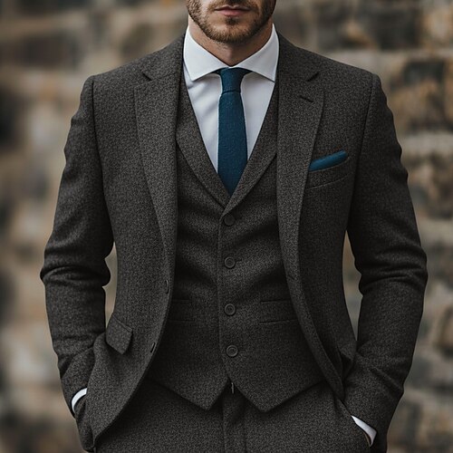 Uomo Affari Casuale Completi in Tweed Bavero classico Nero Grigio chiaro Affari Formale Tinta unita Vestibilità su misura 3 pezzi Monopetto Due Bottoni
