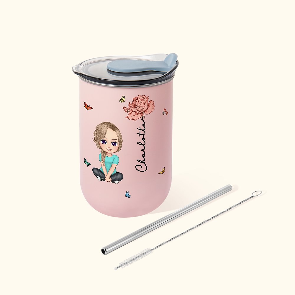 Personalisierter Cartoon-Figur 350ml Thermobecher mit Namen Kaffee Trinkbecher mit Strohhalm Deckel Reise Essentials Party Geschenk für Damen Mädchen