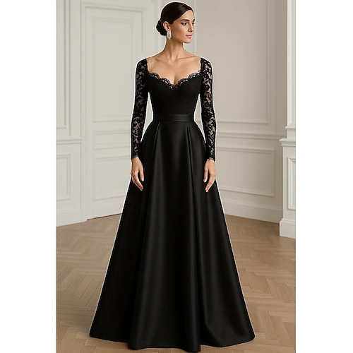 Linea ad A Lunghezza al pavimento Abito da Sera Da principessa Abito formale Elegante Setoso Manica Lunga Scollo a V Matrimonio Formale Tasca Raso Pizzo con Glitter