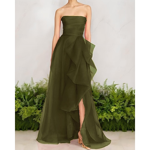 Linea ad A Lunghezza al pavimento Abiti da Ballo Abito da Sera Stile Celebrità Senza Maniche Monospalla Balli di fine anno Formale Organza con Arricciato Volant Spacco