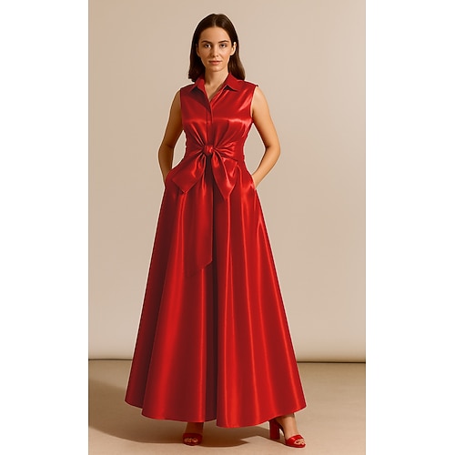 Linea ad A Lunghezza al pavimento Abiti da Cocktail Elegante Senza Maniche Colletto a Camicia Festa in giardino Matrimonio Raso Elasticizzato con Pieghe