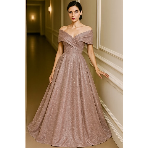 Linea ad A Lunghezza al pavimento Abito da Sera Abito formale Elegante Scintillante Brillanti Manica Corta Senza Spalle Matrimonio Formale Tessuto Lurex con Glitter Paillettes