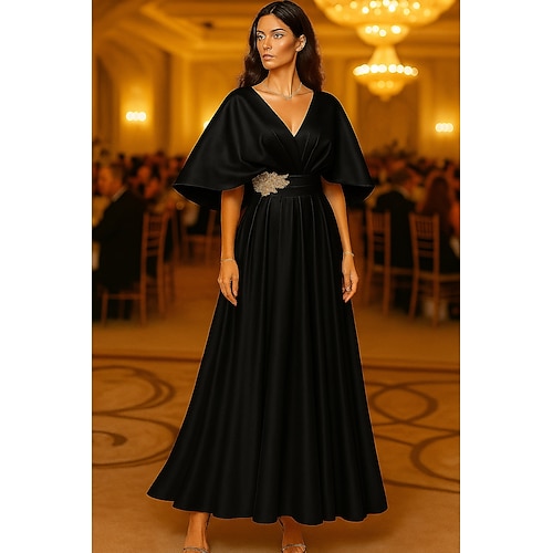 Linea ad A Lunghezza al pavimento Abito da Sera Da principessa Abito formale Elegante Scintillante Setoso Manica Corta Scollo a V Matrimonio Formale Raso con Strass