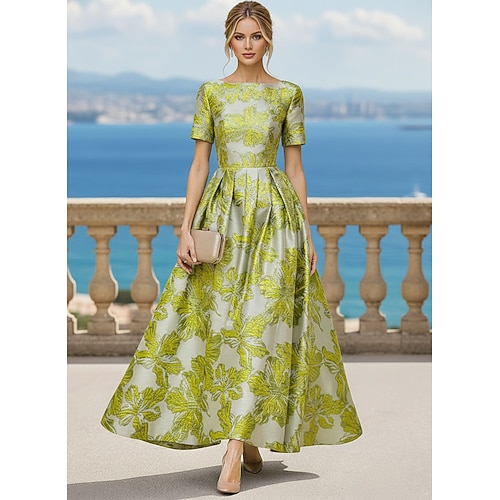 Linea ad A Lunghezza al pavimento Abiti da Cocktail Elegante Vintage Floreale Manica Corta Girocollo Festa in giardino Matrimonio Tasca Jacquard con Stampa floreale Pieghe Tasca