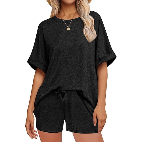 set da notte da donna, 2 pezzi, colore puro, semplice, comodo, casa, strada, cotone, girocollo, manica corta, maglietta, pantaloncini, estate, primavera, abiti da casa