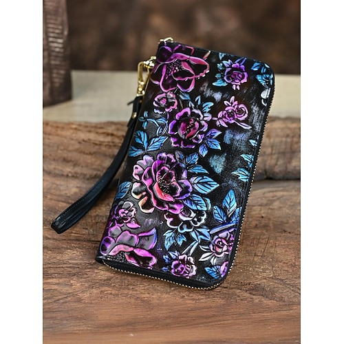 Portafoglio da donna in vera pelle – grande capacità con motivo floreale, chiusura con cerniera, scomparti per carte e tasche per contanti – perfetto per l'uso quotidiano e per le occasioni speciali