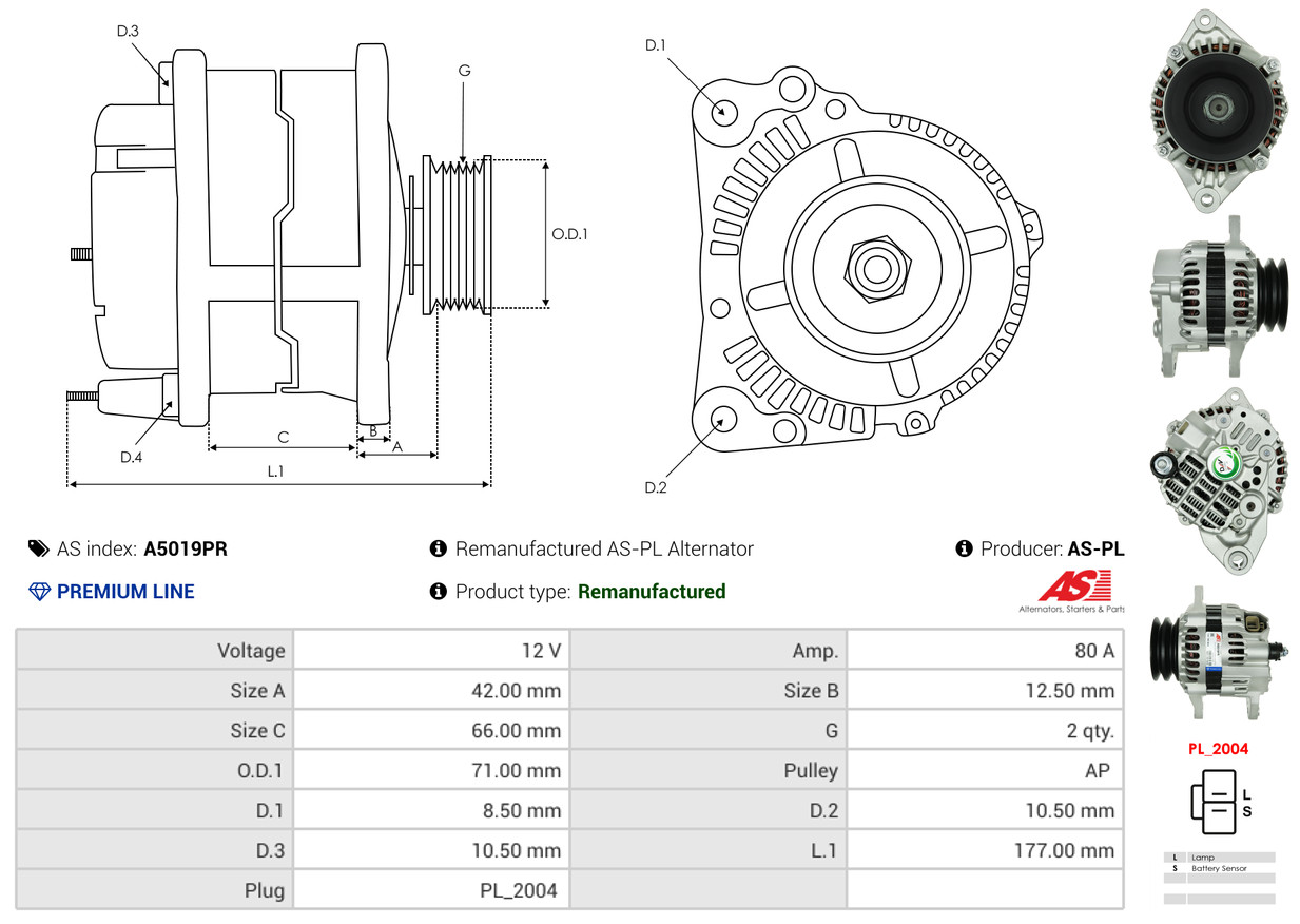 AS-PL Generator A5019PR 12V 80A für MITSUBISHI MAZDA WL1118300 A002TA1099A A002TB1298