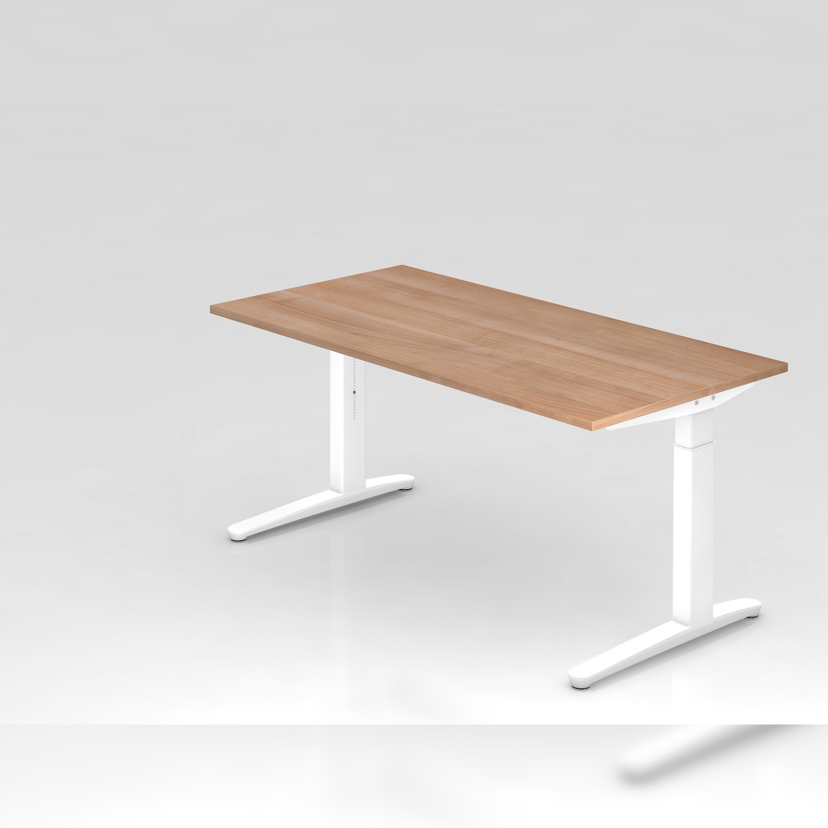 PROREGAL Schreibtisch Mika | Nussbaum | Weißes Gestell | BxT 160x80cm | Arbeitshöhe 65-85cm | höhenjustierbar, 1cm Raster | C-Fuß-Gestell