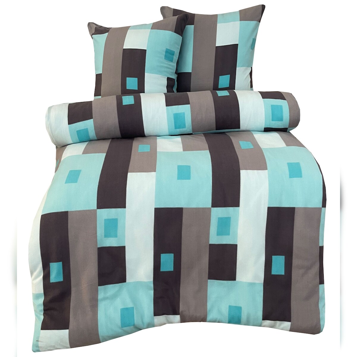 Leonado Vicenti Bettwäsche Thermofleece 200x200 + 2x 80x80 cm türkis grau Vierecke kariert mit Reißverschluss / 3 tlg.