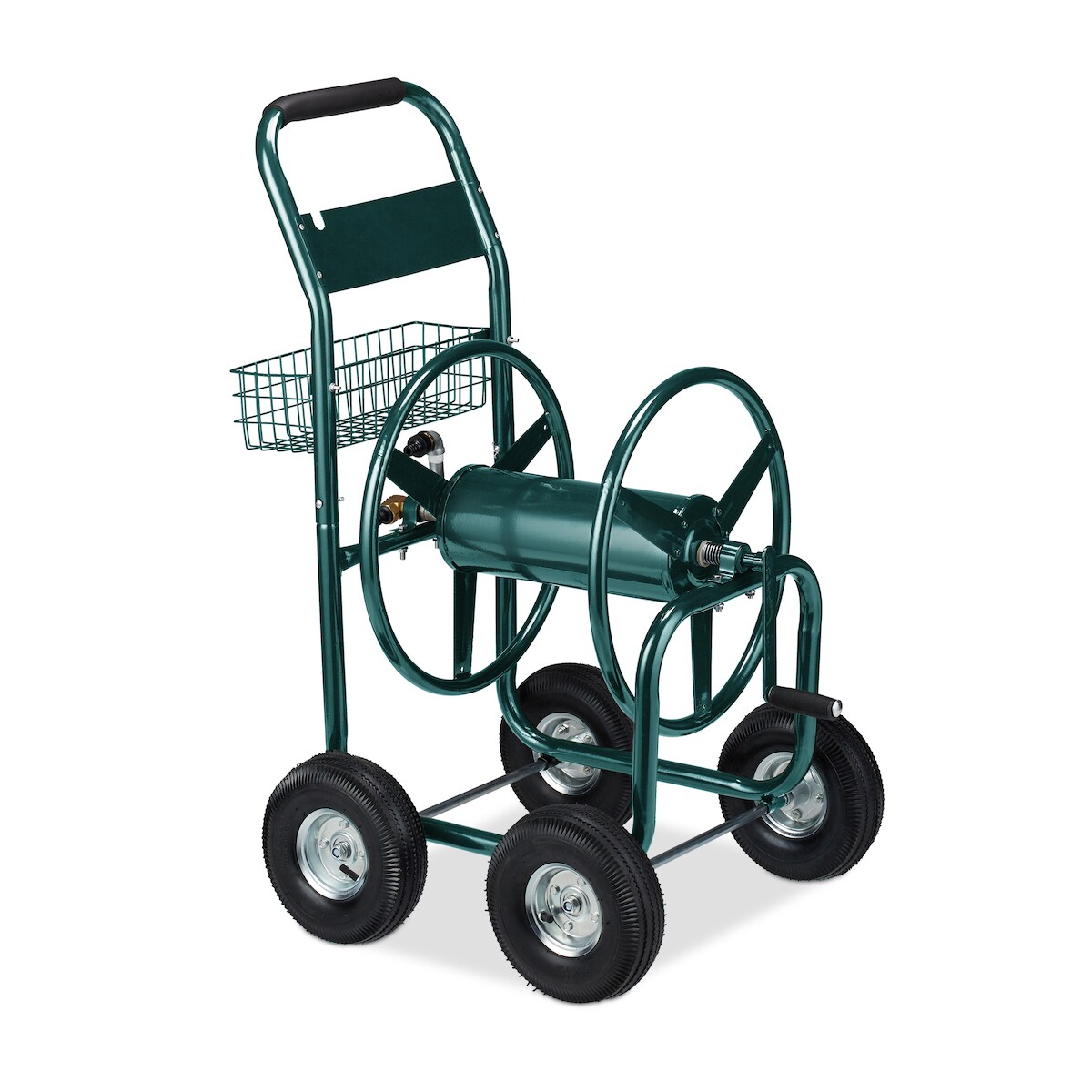 Relaxdays Schlauchwagen, bis 90 m, 4 Luftreifen, Klickkupplung, Schlauchtrommel Metall, Schlauchabroller mit Korb, grün