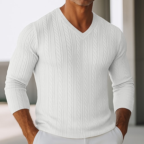 T-shirt da uomo slim fit a coste con scollo a V, manica lunga, casual, attillata, in maglia, modello attillato, primavera autunno inverno, tinta unita, stile stilista, basic, maglia, vacanza, strada, casual, nero, bianco, viola