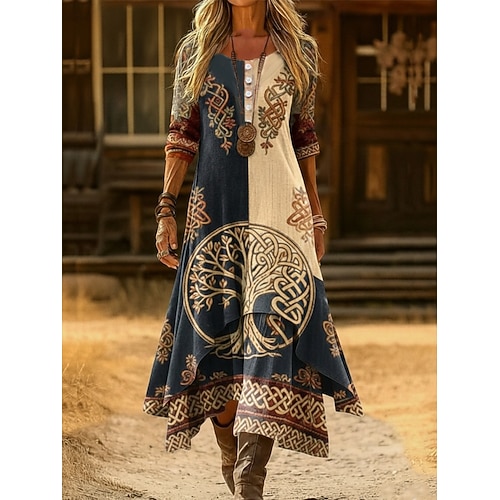 Per donna Abito Midi Abito a Tubino Vacanza Casual Boho Quotidiano Ferie Vestibilità regolare Floreale Grafico Geometrico Manica Lunga Girocollo Scollo a V Marrone chiaro Autunno Inverno