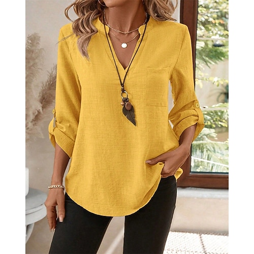 Per donna Camicia Abbottonare Blusa Finto cotone e lino Tinta unica Elegante Casual Manica Lunga Scollo a V Top Regolari Quotidiano Tasca Bottoni Nero Arancione Verde Beige Primavera Autunno