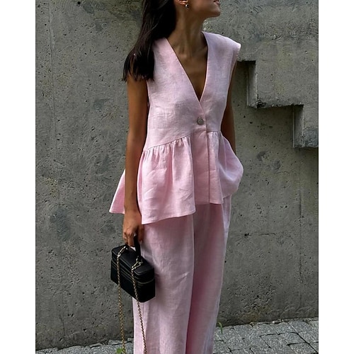 Per donna Elegante Moda Streetwear Misto cotone Set da due pezzi Set di Pantaloni Senza Maniche Scollo a V Tinta unica Coulisse Casuale Quotidiano All'aperto Nero Bianco Rosa Estate Vestibilit