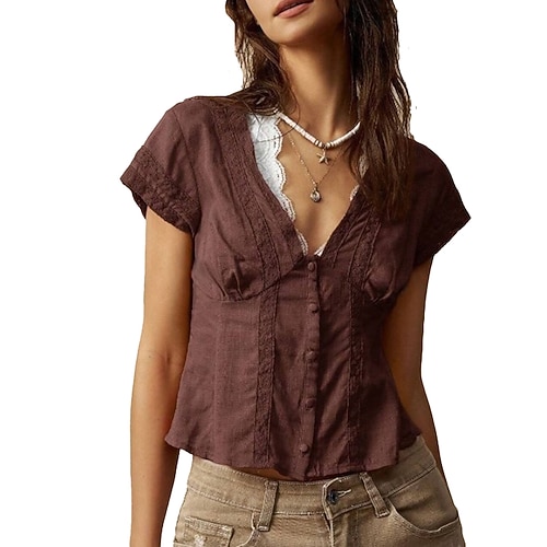 Per donna Blusa Semplice Vintage Elegante Manica Corta Scollo a V Top Regolari Quotidiano Ferie Uscire Bottoni Nero Marrone Rosa Estate Primavera