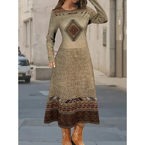 Per donna Abito maxi Tubino Abito a Tubino Festa Casual Boho Feste Ospite di nozze Quotidiano Vestibilità regolare Floreale Grafico Paisley Manica Lunga Girocollo Nero Marrone Verde Primavera Autunno
