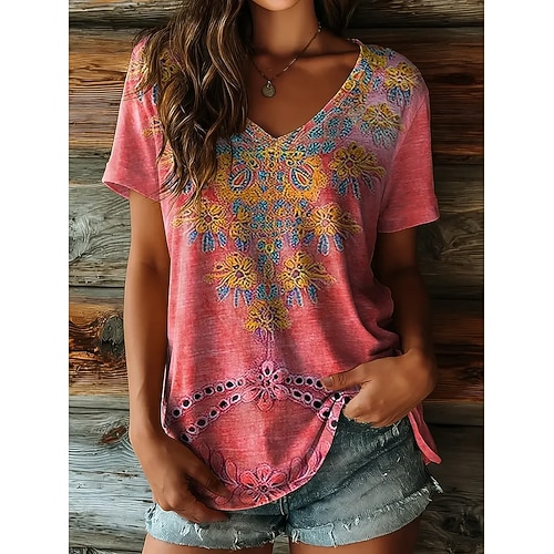 Per donna Maglietta Floreale Grafico Vintage Elegante Casual Manica Corta Scollo a V Top Regolari Quotidiano Stampato Blu Rosa Viola Estate Primavera