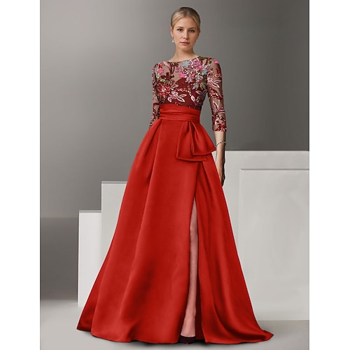 Abito da Sera A-Line Ricamato Floreale Elegante Formale Matrimonio Lungo Fino al Pavimento Mezza Manica Collo a Camicia di Satin con Fiocco(e) Spacco