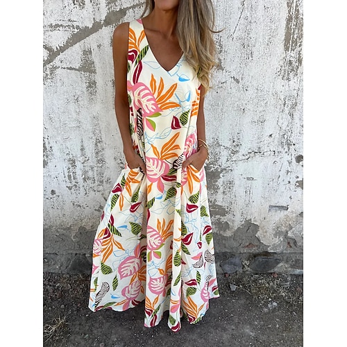 Per donna Vestito longuette Abito casual Abito linea A Moda Informale Da mare Giornaliero Spiaggia Standard Floreale A foglia Senza maniche A V Blu scuro Albicocca Beige Estate