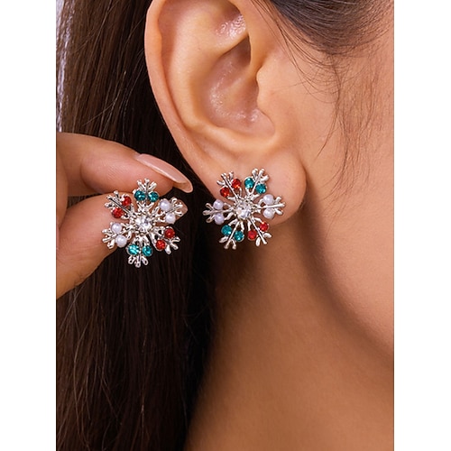 orecchini da donna a forma di fiocco di neve natalizio: materiali in lega e perle sintetiche, pietre festive rosse, verdi e trasparenti, perfetti per feste e regali