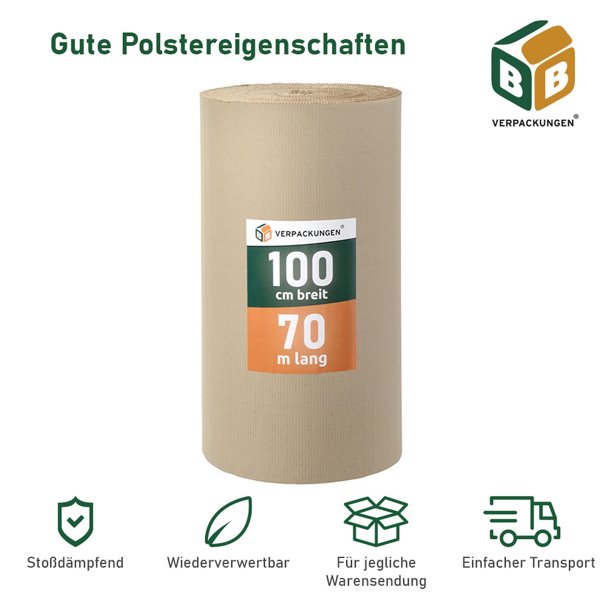 BB-Verpackungen GmbH 2 x Rollenwellpappe (1,0 x 70 m) Wellkarton Füllmaterial Polster Schutz Rollwellpappe BB-Verpackungen