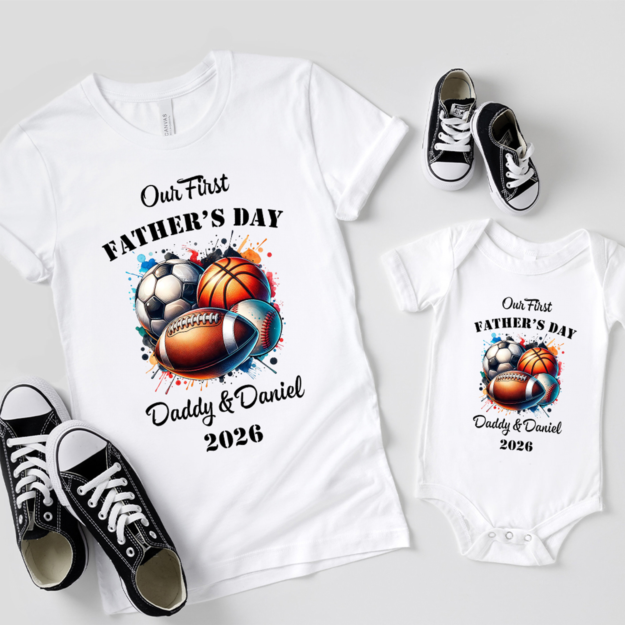 Personalisierte Bälle Muster unserer ersten Vatertag 100% Baumwolle T-shirt Baby Bodysuit mit Namen und Jahr Geburtstag Vatertag Geschenk für Baby Vater