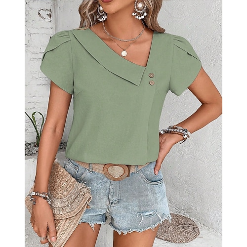 Per donna Blusa Top eleganti Tinta unica Liscio Elegante Essenziale Manica corta A V Top regolari Giornaliero Increspato Nero Bianco Rosa Blu Estate