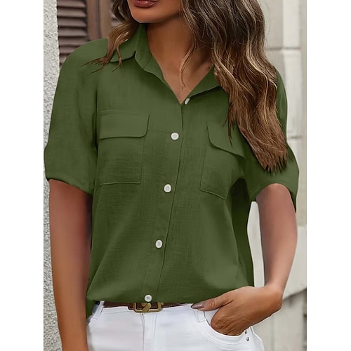 Per donna Camicia Camicie di cotone e lino Patchwork Tinta unica Vintage Elegante Classico Manica Corta Colletto a Camicia Top Regolari Quotidiano Ferie Uscire Nero Bianco Rosso Blu Reale Verde