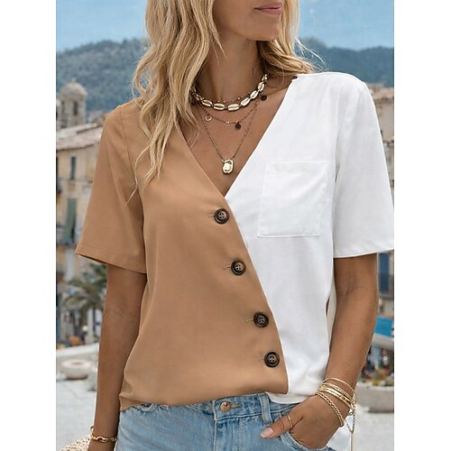 Per donna Camicia popover Camicia Estiva Camicia casual Blusa Patchwork Bottoni Tinta unica Vacanza Elegante Casual Manica Corta Scollo a V Top Regolari Quotidiano Spiaggia Ferie Nero Giallo Cachi