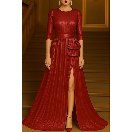 Linea ad A Lunghezza al pavimento Abito da Sera Abito formale Elegante Spacco Alto Setoso Manica Lunga Girocollo Matrimonio Formale Raso con Fiocco/Fiocchi Arricciato Spacco