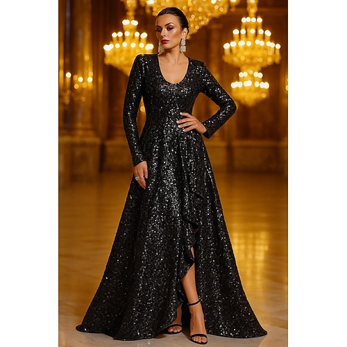 Linea ad A Lunghezza al pavimento Abito da Sera Da principessa Abito formale Elegante Scintillante Spacco Alto Manica Lunga Girocollo Matrimonio Formale Con Paillettes con Glitter