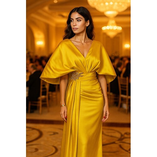 Linea ad A Tubino Colonna Lunghezza al pavimento Abito da Sera Da principessa Elegante Scintillante Setoso Manica Corta Scollo a V Matrimonio Formale Raso con Glitter