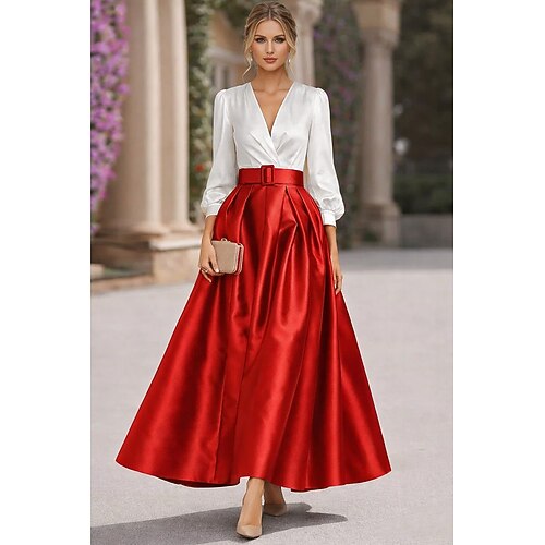 Linea ad A Lunghezza al pavimento Lunghezza alla caviglia Abiti da Cocktail Elegante Manica Lunga Scollo a V Festa in giardino Matrimonio Raso Taffetà con Pieghe Arricciato