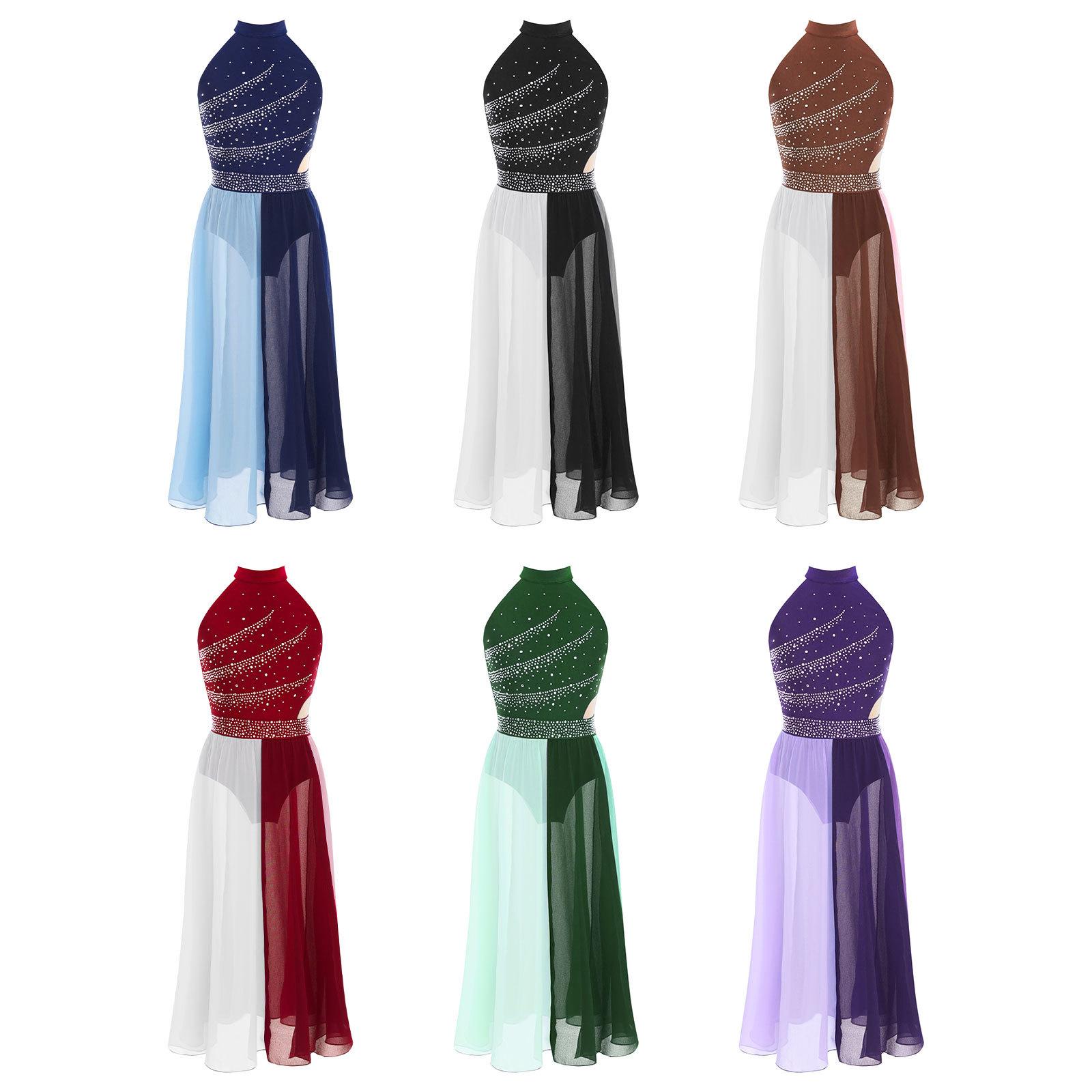Robe de danse lyrique moderne pour filles sans manches col montant costume en mousseline avec fermeture éclair invisible au dos strass et fente latéra
